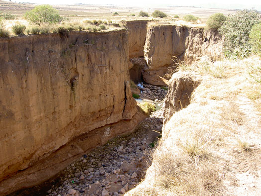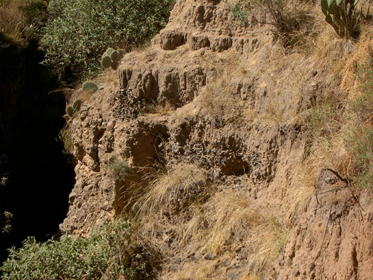 更に少し歩くと、巨大な谷(多分、用水路)があり、そこをよく見ると崖から黒曜石が顔を出していました。そこで、K君とともにこの崖に沿って歩く事に。