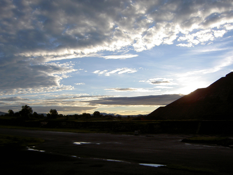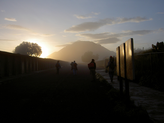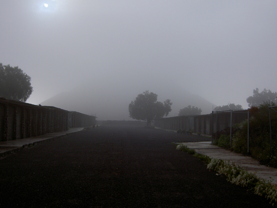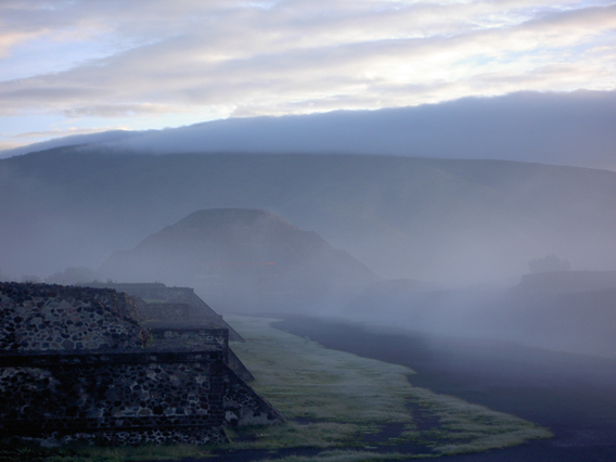 たまに、遺跡が霧に覆われてしまう日もありました。左側の写真は霧に覆われた太陽のピラミッド。正面にみえるはずのピラミッドがほとんど見えません...。右は月のピラミッド。中央の奥の方にうっすらと見えるのが月のピラミッド。