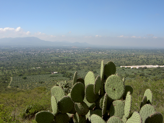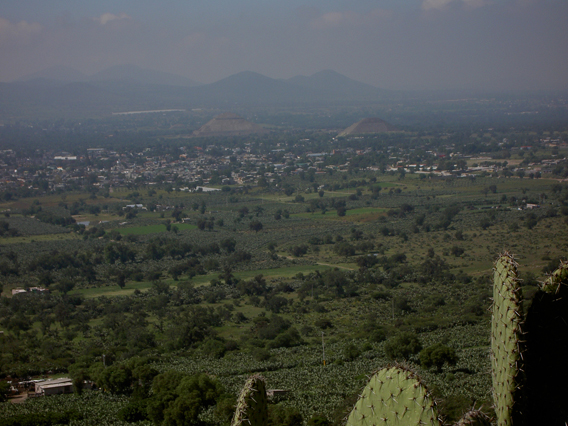 山から眺めたテオティワカン。真ん中の遠くの方に見えるのが太陽のピラミッドと月のピラミッド。見えるでしょうか???右側の写真はちょっと寄ってみたテオティワカン。うっすらとピラミッドが見えるのでは?