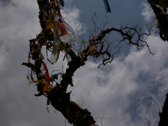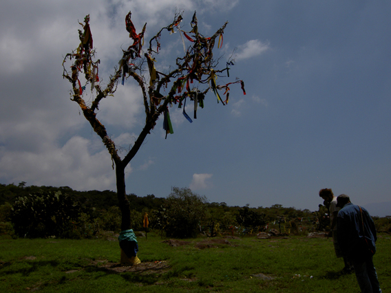 その代わりと言っては何ですが,途中で現代の人たちが使っているらしい儀礼の場所にたどり着きました。左の写真に写っている円形の部分はA君曰く、テマスカル(蒸し風呂)の跡らしい。身を清めたりしてるのかも???真ん中の写真は、広場の中央にある木。沢山の布切れが巻き付けられている。右の写真も同じ木。