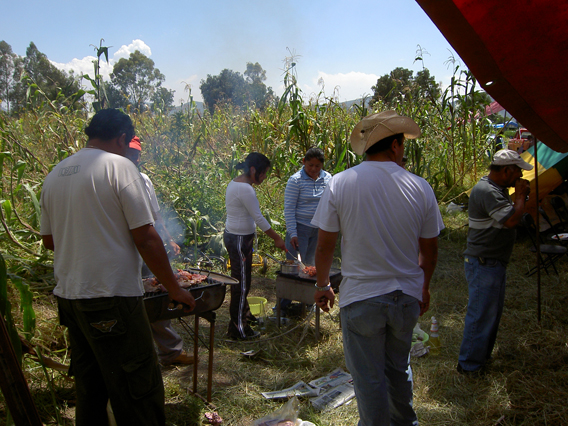 金曜日は生憎の雨模様でしたが、メキシコシティからも大御所の先生方がやってきて最大で40人近く集まったようです。鶏肉のミシオーテがメインで一通りのふぃえすたメニュー(トラコーヨ、アロス、カルド・デ・ポージョ)が振る舞われました。その他にも当然の如く大量のアルコール(ビール、テキーラ、ロン,プルケなどなど)も用意されていました。最後は恒例のバイレ...。