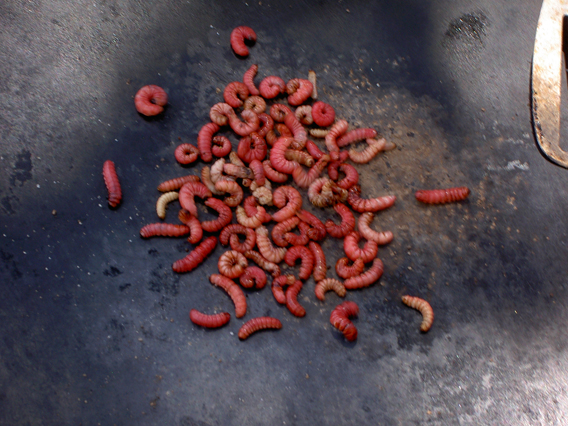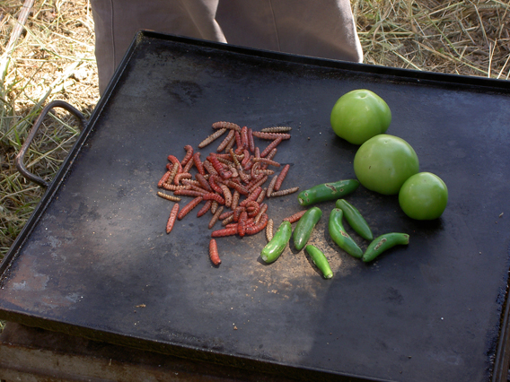 そして、この地域のお祭りに欠かせないものミチクウィル。これはテキーラやプルケというお酒の原材料となるマゲイ(竜舌蘭)についている赤い色のイモムシ。これを火であぶり、同じく火にかけたチレと緑色のトマトと一緒にすり潰してサルサ(辛いソース)にします。おつまみとして焼いたままのものや生でも食べます。右側の写真は虫に弱い人はクリックしないように!