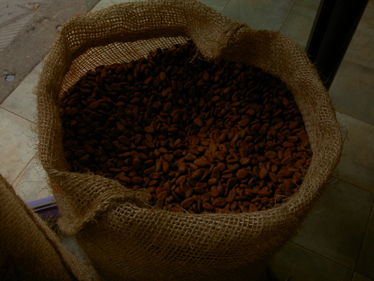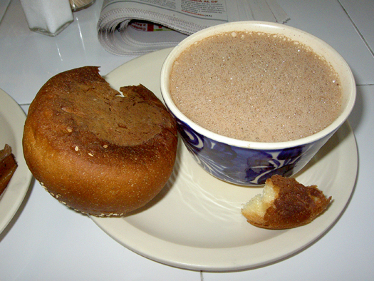 朝食に市場で食べたオアハカ風タマーレス、チョコラーテとパンのセット(すいません、食べ始めてから写真を撮りました...)。あまりの美味しさに食べ過ぎてしまった...袋に入っているのはカカオの実