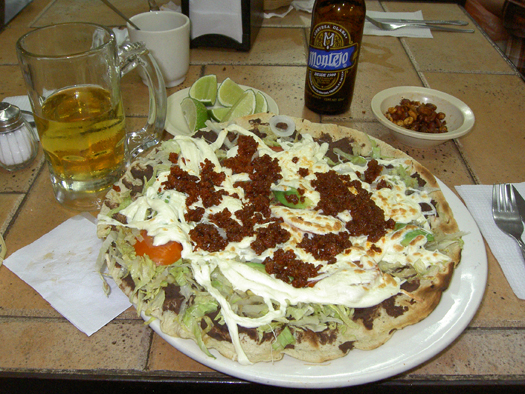夕飯に食べたオアハカ名物トラジューダ(Trayuda)。巨大なピザのような食べ物。僕はオアハカチーズとチョリソのトッピングを選びました。一人で完食