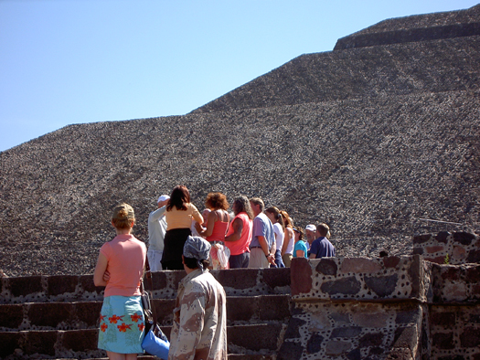 太陽のピラミッドの前でピラミッドパワーを受ける人たち