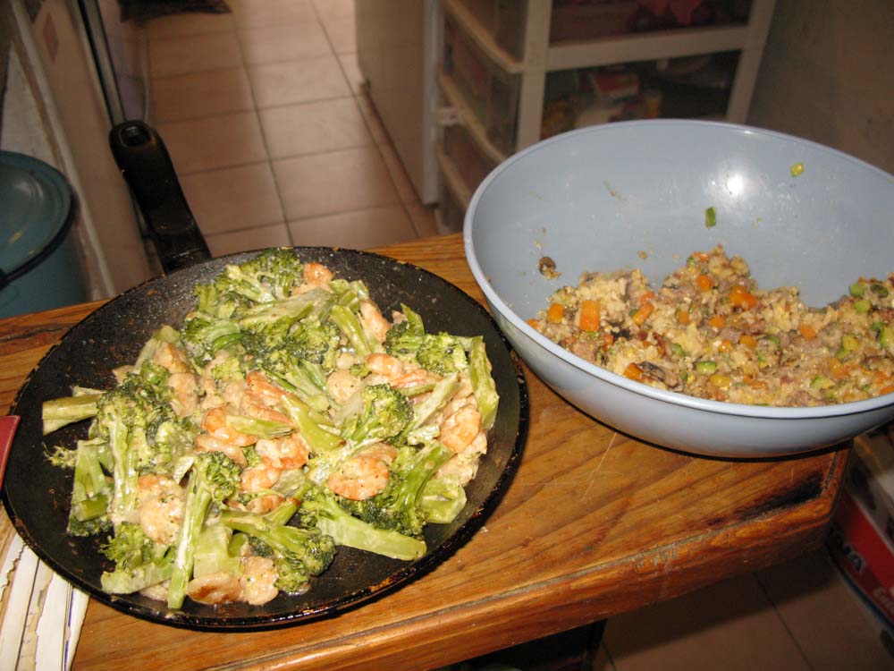 (写真:チャーハンとエビとブロコリーのマヨネーズ炒め、おまけのRoberto家のペットNena)