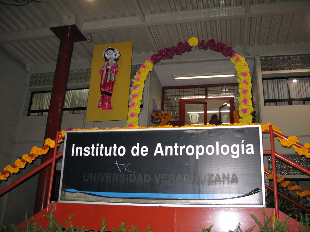 博物館の向かい側にあるベラクルス大学の人類学研究所でも死者の日の為の祭壇が用意され、夕方7時からその開催セレモニーがあるという事で友人達と再びタマーレスを求めて出かけました。セレモニーには沢山の人が集まっていて、なかなか友人たちを見つける事ができませんでしたが、携帯電話のおかげでなんとか友人達と合流する事ができ、パン、タマーレス、ホットチョコレートの3点セットにもありつく事ができました。この日は、仕事のあと一度家に帰り夕飯を食べてから来たのですが、この3点セットの為に若干控えめの夕食にしたので美味しくそれらも食べる事ができました。