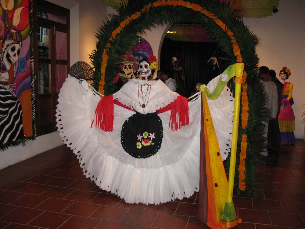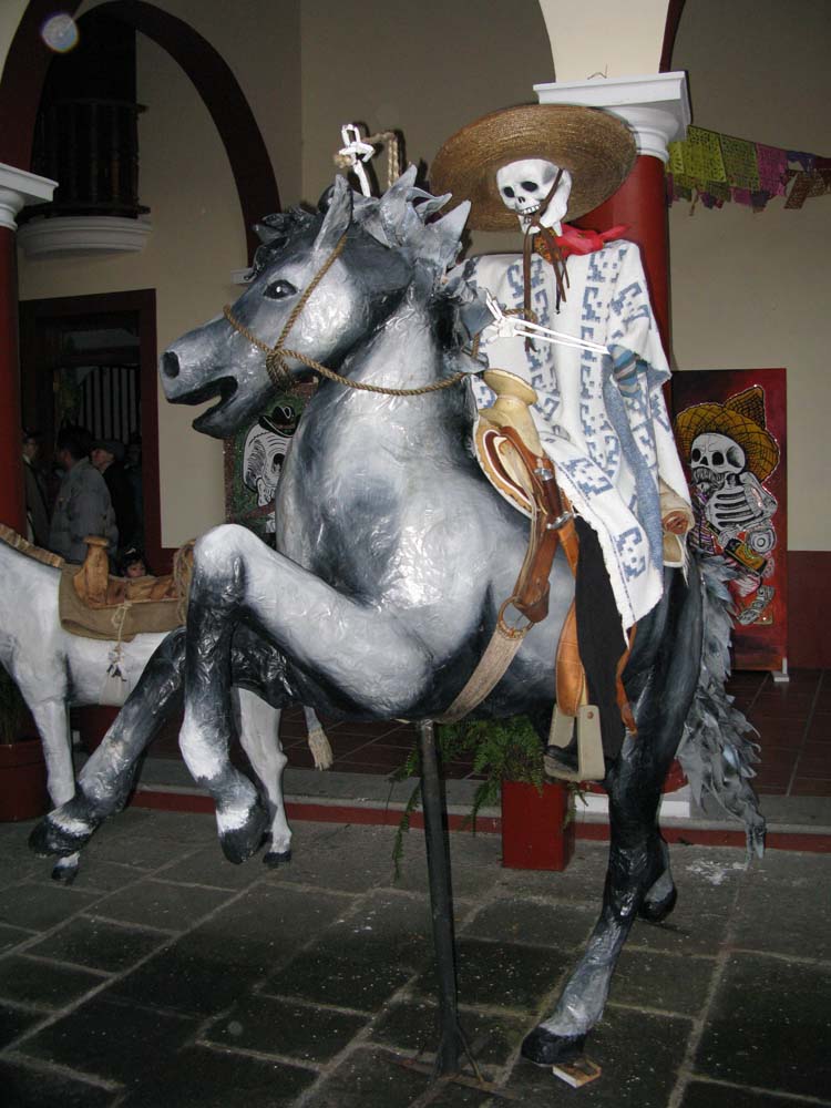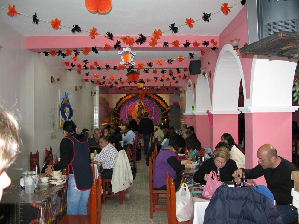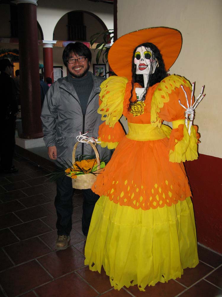 11月1日、メキシコの死者の日が始まる日です。まあ、日本のお盆のようなもので各家庭で祭壇を用意し死者が帰ってくるのを迎えるようです。友人達とハラパの近くにあるNaolincoという小さな町にその様子を見に行く事になり出かけました。午後4時頃に町に着くとすでに人が集まり始めていて、レストランなどはかなり混雑してました。まずは腹ごしらえという事でレストランで食事。町の至る所で死者の日の飾り付けがされていて、レストランも綺麗な祭壇が用意されていました。