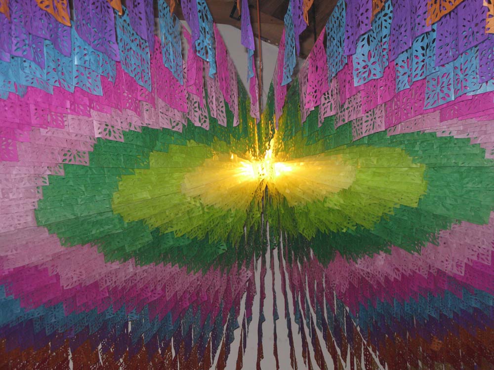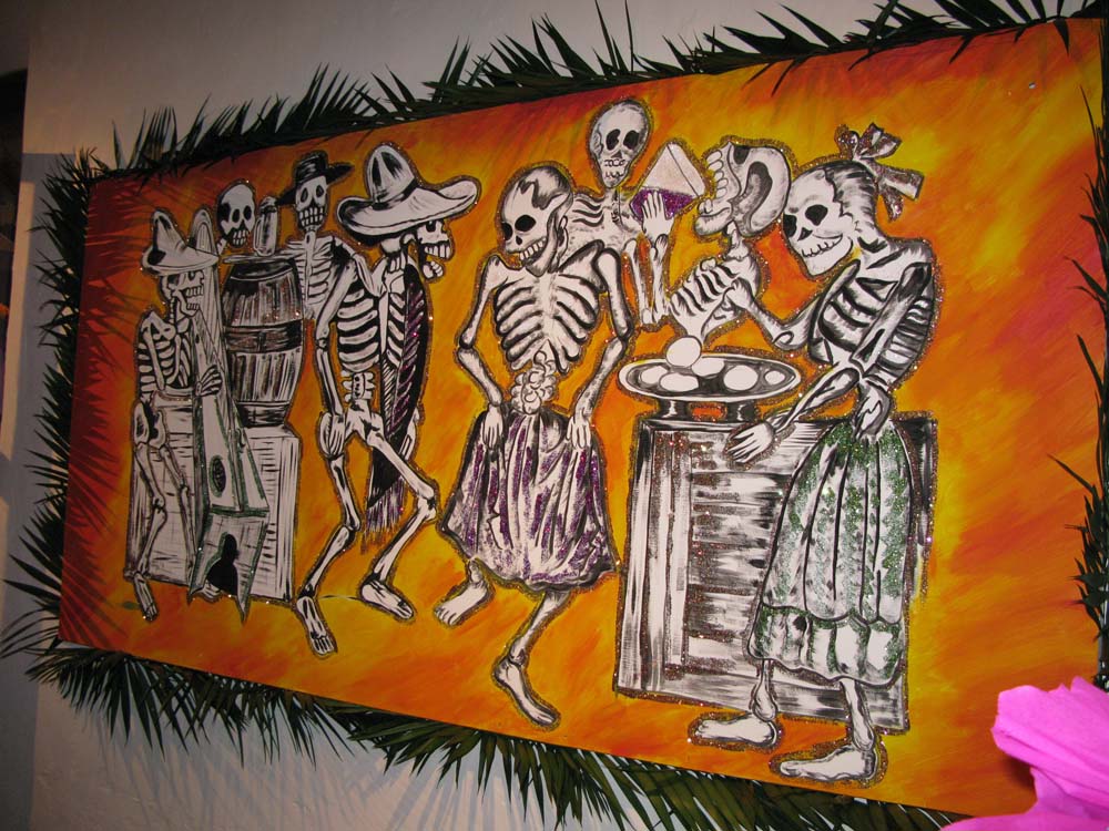 (写真:綺麗に着飾った骸骨達。祭壇と天井の飾り付け)