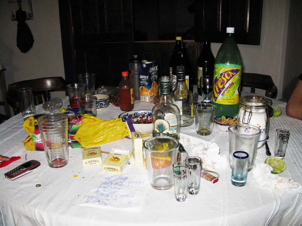 試験は問題なく終わり、無事に学位が授与された。これで、彼も名実共に立派な考古学者の仲間入り。メキシコでは、学部の授業履修が終わってから卒論を提出するのですが、多くの人たちが、履修後数年経って学位を取ります。彼は一体何年かかったんだろう...。年齢は遥かに僕の上をいってます。まあ、何はともあれ無事に学位を取った彼の家で皆でお祝い。当然、テーブルの上には沢山のビールやテキーラが並び、皆で大騒ぎ。
