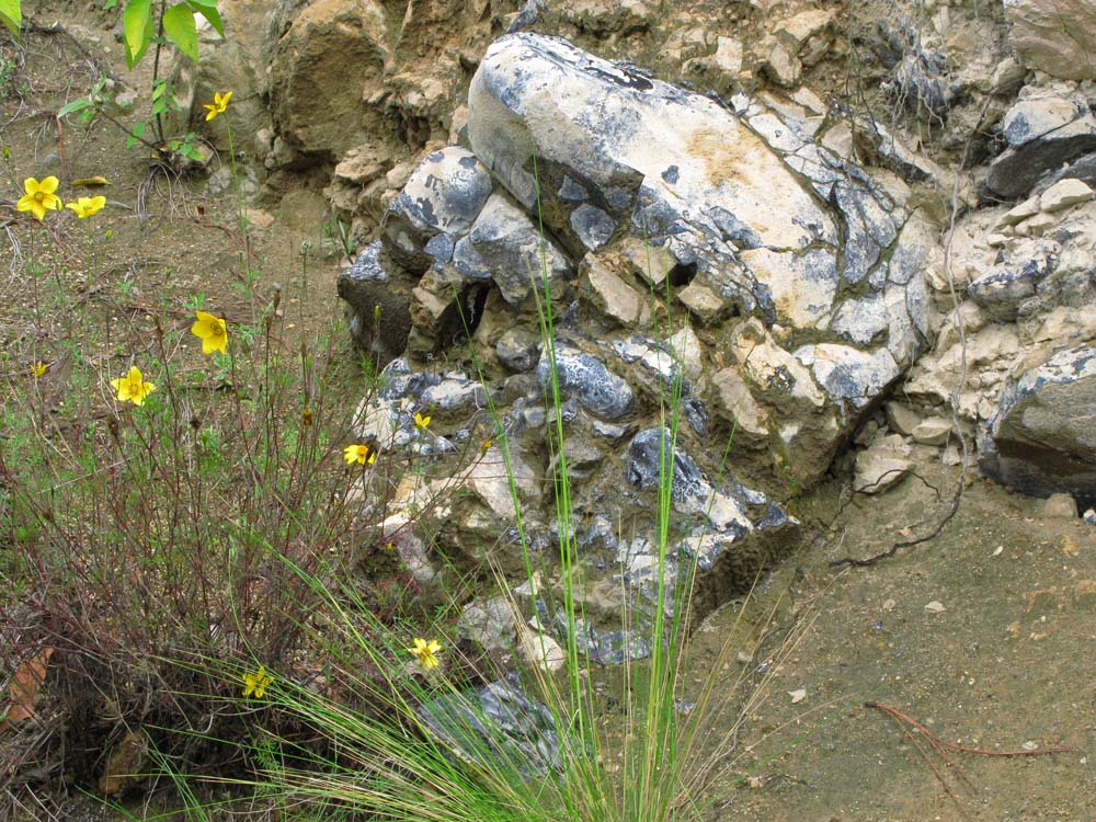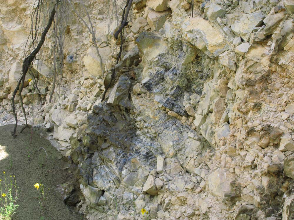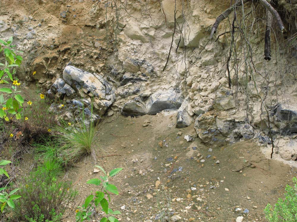 (写真:地面に転がる黒曜石と崖にはまっている黒曜石の塊(黒っぽい部分が黒曜石の塊))