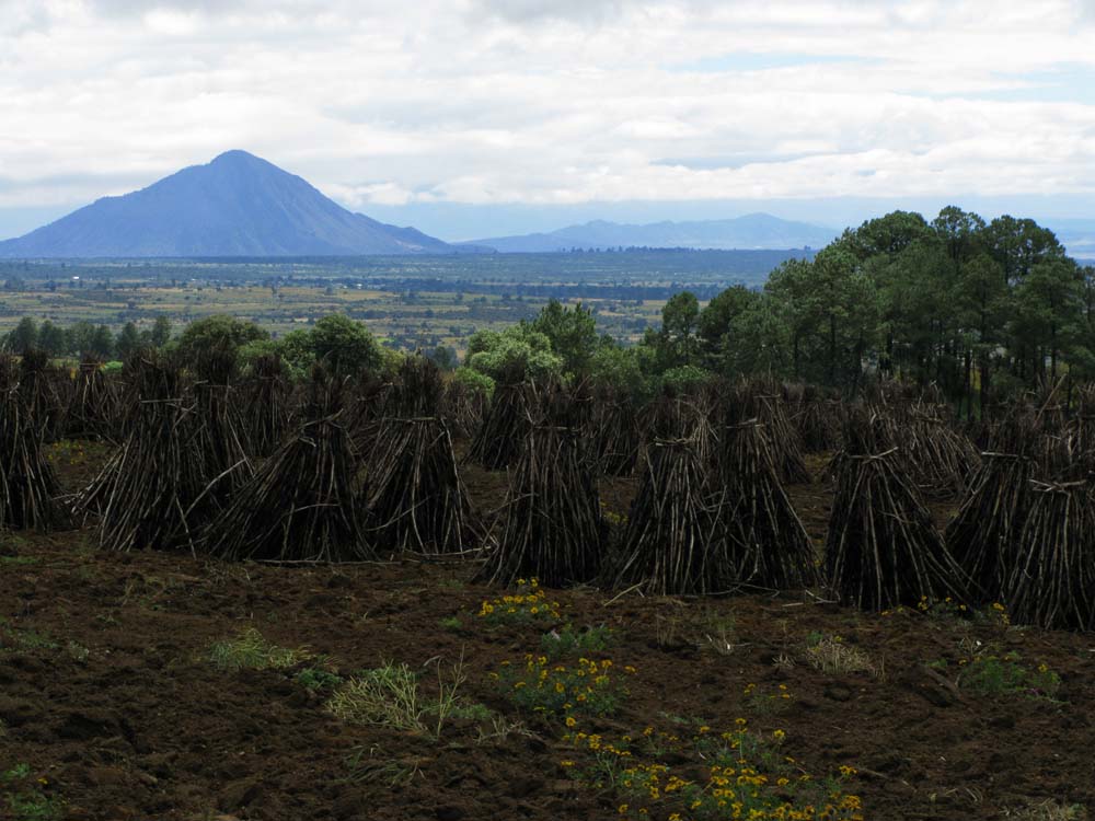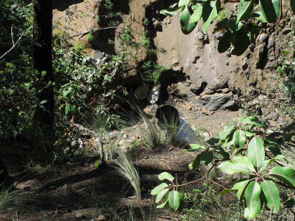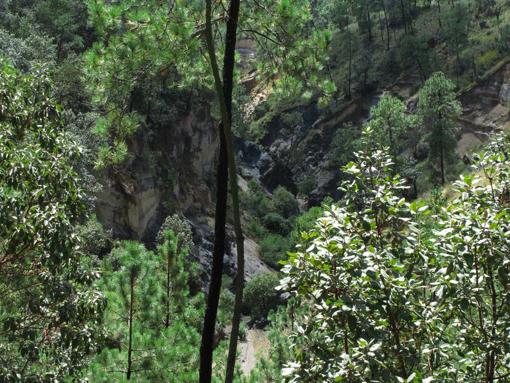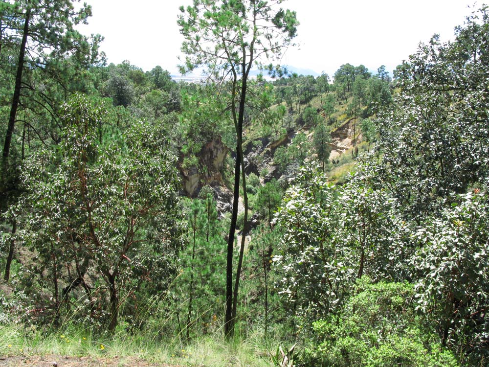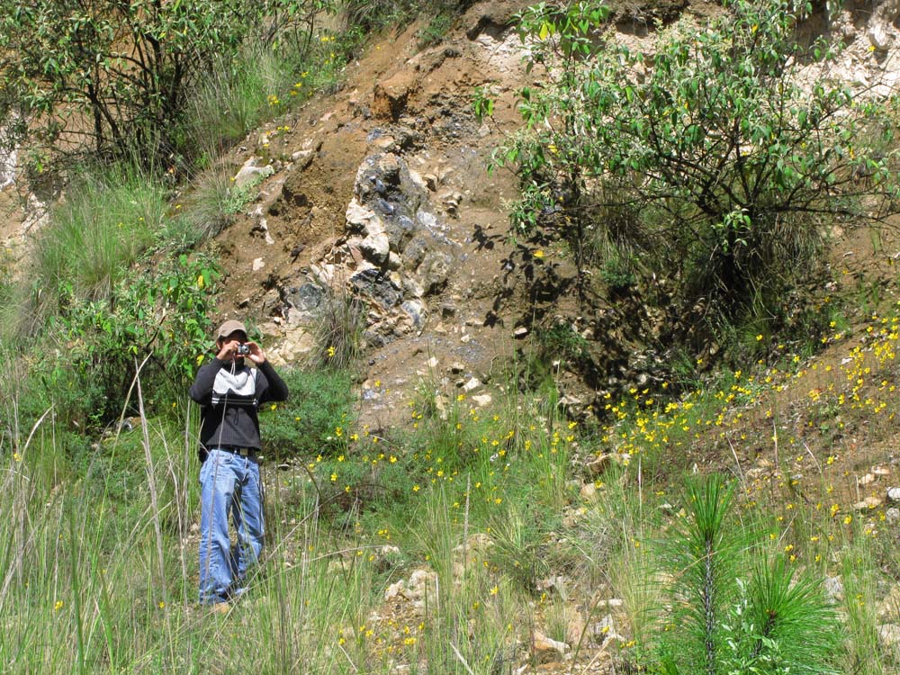 予想以上に黒曜石の原石がゴロゴロと転がっていて、メキシコ人の学部生は大喜びで黒曜石を拾っていました。崖にも大きな黒曜石の塊がはまっていました。一通りサンプルを採集し、次の目的地、Oyameles村の近くにある谷間に移動。