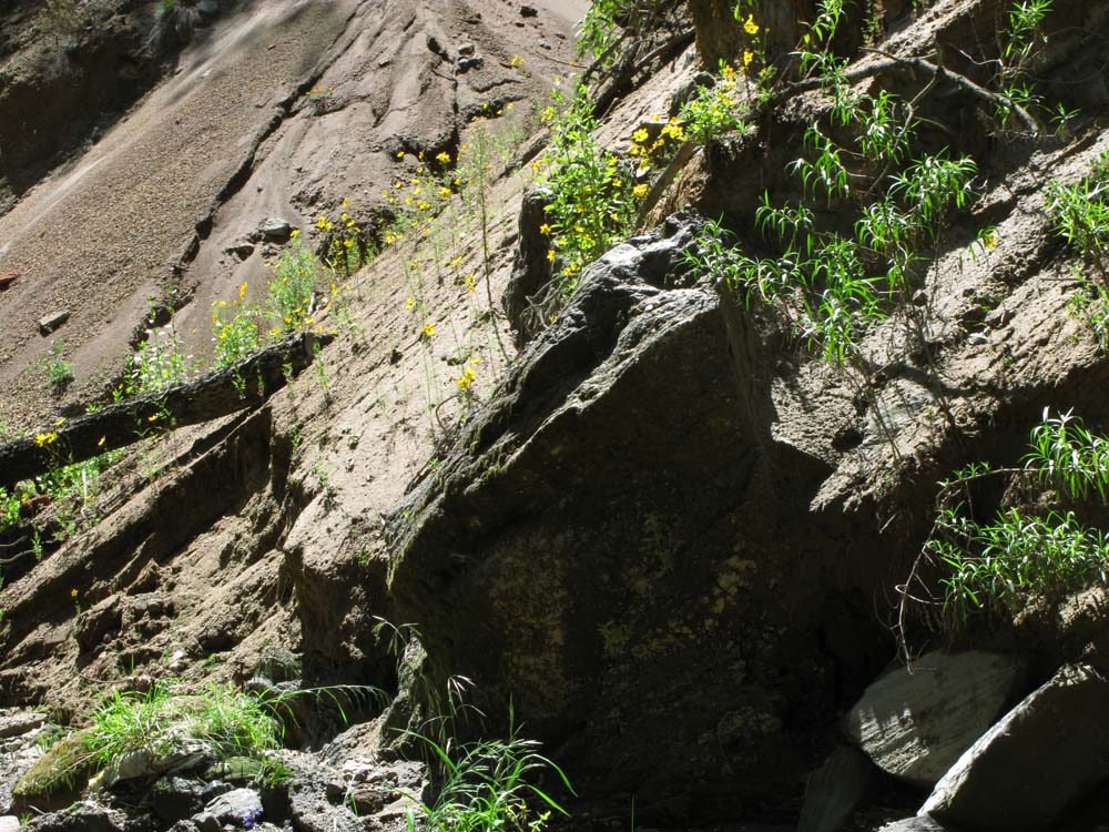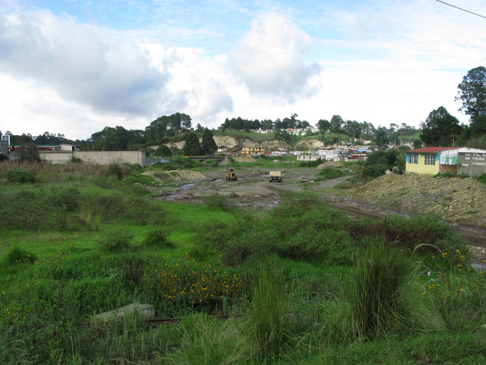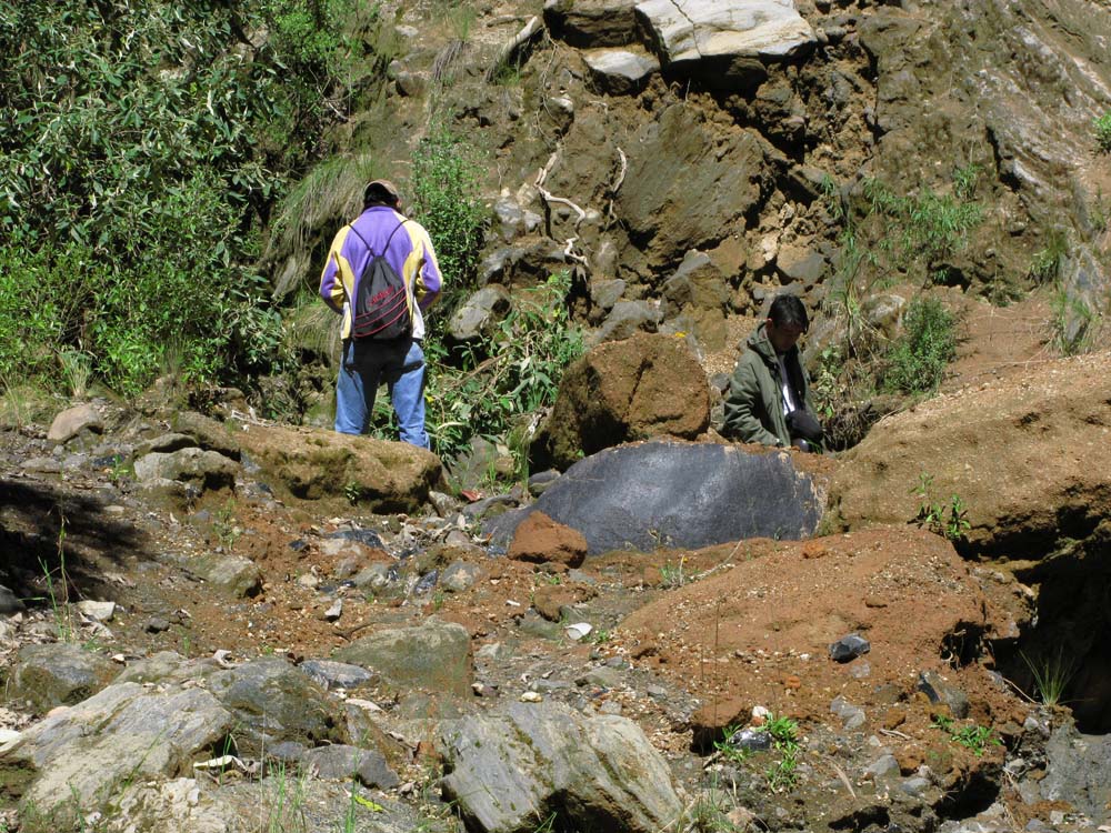 村の中は至る所で大きな水たまりが道を塞いでいて、午前中の嫌な記憶がよみがえりつつも可能なかぎり先へ進む。村はずれまであと少しというところで大きな水たまりに完全に道が塞がれていたので、車で進むのをあきらめ歩いて行く事に。畑の脇の小道を進んでいくと崖の上に出る。あまりに急な崖だったので躊躇するが、若いメキシコ人学生はさっさと下へ向かって降りて行く。後で、聞いた話では彼はメキシコの山間部の出身らしく、このような道なのか崖なのか分からないような所も子供の頃から歩いていたらしい...。僕はもう少し安全そうな所が無いかと少し横にそれて道を探すが、見つけたのは参考文献の写真に似た風景だけで、仕方が無いので腹をくくり下へ向かって降りて行く事にする。