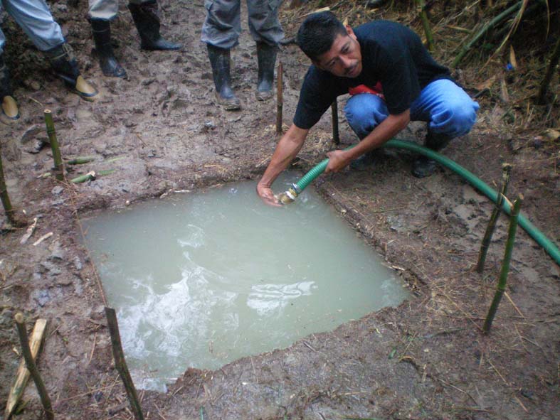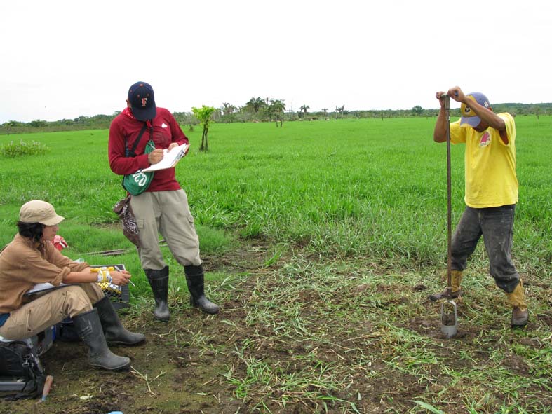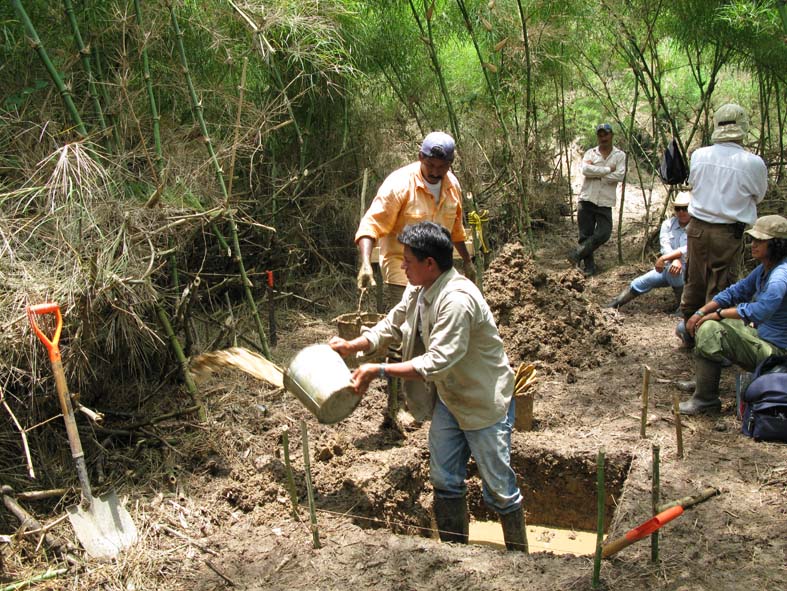 というわけで、調査は40年前の発見現場の近くでボーリング調査をすることに。実際に、足を踏み入れてみるとそこは沢山の樹々に覆われていてまるでジャングル、そして至る所に盗掘の跡が残っていました。アメリカ人の学生さん達はこのようなボーリング調査の経験が無いということで、初めは2つのグループに分けメキシコ人で経験がある学生をそれぞれにつけて、だいたいの作業の流れを覚えてもらうことにしました。同時に、おおまかな地層の特徴を見るという目的もあり、可能なかぎり深い地層の土を採るようにしました。
