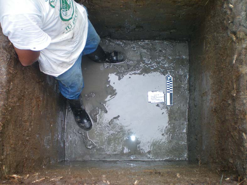しかし、予想通りというか残念ながら、試掘坑からは1点の考古遺物も見つかりません。挙句の果てには、試掘坑内に水が湧いて来て通常の発掘のようにはいかなくなってきました。仕方が無いので大きい方の試掘坑も1x1メートルに縮小し、可能なかぎり下まで下げるということで作業を続けてもらいました。しかし、掘れども掘れども、出てくるのは泥と水ばかり。結局、何も見つからないまま。最終的には最初にも書いたように6カ所で試掘坑を開けたのですが、試掘坑からは考古遺物は何も見つかりませんでした。